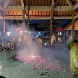 In the evening, we watched a kecak dance performance in Ubud. The Kecak dance is a Balinese dance drama based on the ancient Indian Ramayana epos. The story is traditionally told by 50 to 100 singing men (this time, there is no gamelan orchestra, just the human's voices) who are accompanied by dancers. The dancers represent Rama, his wife Sita, the monkey king Hanuman and the demon king Ravana. We attended the only version of Bali with exclusively female singers. It was very impressive to follow their rhythmic body movements and their unfamiliar vocal sounds. The Kecak dance ends with a "real" fire on the floor of the dance floor, which is supposed to burn the monkey king Hanuman. However, as he possesses supernatural powers, the flames cannot harm him so the dancer representing Hanuman runs over the glowing charcoals several times with his bare (!) feet and also puts glowing charcoal in his mouth for some seconds.Baca lagi
