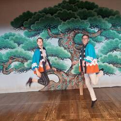 The temperatures on my morning run to Matsuyama-castle at 7:00 am were already very high despite early morning hours. Nevertheless, I enjoyed the morning view on the city before we left the hostel by car, heading south of the island. We visited the sleepy and historically important town of Uchiko where traditional Japanese architecture from the Edo period (1600 -1868) and the Meiji period (1868-1912) is still preserved. To begin with, we took a look at the Kamihaga residence and the wax museum there. The Kamihaga family became famous for trading in Japanese wax which is extracted from the fruit of the sumac tree, and brought wealth to Uchiko. At the Kamihaga residence, we saw the inside of the traditionally Japanese house as well as all the rooms of the manual wax production. Afterwards, we walked down the street to look at the preserved historical house facades. During lunch time, we took a short break at a bakery "Charm" where we tried delicious bakery products on tatami mats and low Japanese tables - it really had its charm! My personal highlight was a strongly matcha-tasting cake bun with white chocolate sprinkles, which I hope to recreate at home by experimenting in the kitchen. The next stop in town was the "History and Folklore Museum" which showed the typical life of an urban working-class family in various scenes. In this museum house, you could see the life of a family running the pharmacy of the town around 1921. The family members were portrayed as human-sized dolls participating in various activities in the house: The family eating breakfast together on tatami mats, the founder of the family business reenacting a game of Go in his private room, the employees waiting for customers behind the store counter, or the housemaid washing dishes in the kitchen. After this authentic participation in early Japanese life, we visited the Uchiko-za Theater, built in 1916. The human-powered revolving stage, the flower walkway, the seating boxes of the audience and the basement are well preserved to this day and are still used for events.