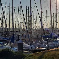Bei Wind im Segelyacht-Hafen, beginnt der besagte zu singen, sobald er durch Mast, Baum, Wanten, Fallen und die Schoten bläst... ein lustiges Phänomen, dass der Entspannung keinen Abstriche verursacht - der Kaffee kann weiter in Ruhe dampfend genossen werden... ☕️