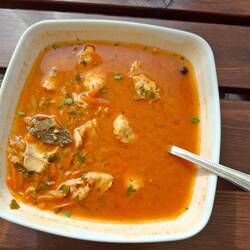 Nach einem schönen Frühstück auf der Terrasse sind wir mit Rucksack zum Hafen gewandert. Dort gab es eine tolle Fischsuppe. Als Souvenir gab's 2 Muscheln und ein leckeres Eis.