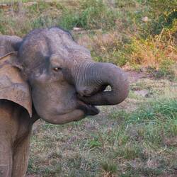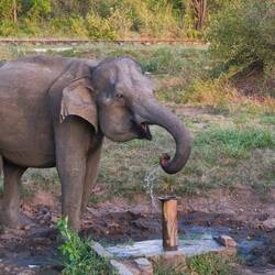 An einer Wasserstelle, extra für die Elefanten eingerichtet, sehen wir noch, wie ein Elefant mit seinem Rüssel Wasser aus dem Wasserrohr holt und immer wieder trinkt🐘Læs mere