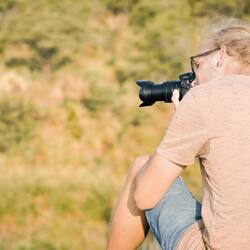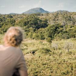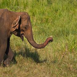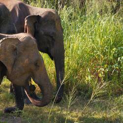 Schon bald kommen wir an einen kleinen Fluss, in dem sich Mama Elefant mit einem kleineren Elefanten badet. Als das erwachsene Tier aus dem Fluss steigt wird der Blick frei auf einen ganz jungen kleinen Elefanten. Er ist sogar noch ganz haarig! So schnell es kann flitzt es hinter seiner Mama her und verschwindet im dem hohen Gras.