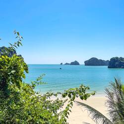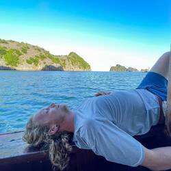 Wir drei liegen hinten auf dem Deck in der Sonne und genießen das sanfte Schaukeln und Tuckern des Bootes. Der Himmel ist strahlend blau und durch die Sonne angestrahlt glitzert das Wasser blau-türkis. Aus dem Wasser ragen immer wieder kleinere und größere Felsen - einige von ihnen sogar mit eignem Sandstrand.