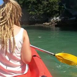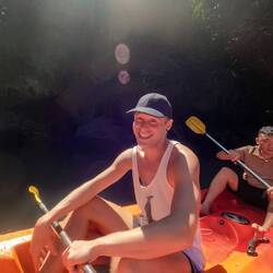 Marjolein. Der Plan ist nun zurück zum Boot zu paddeln, um die nächste Stelle anzufahren. Die Franzosen sowie Lám und Robin paddeln super schnell in ihren Kajaks, während Rainer und ich eher langsam unterwegs sind.
