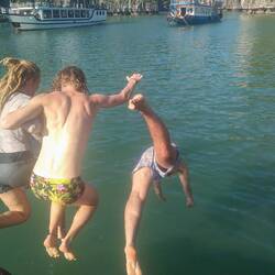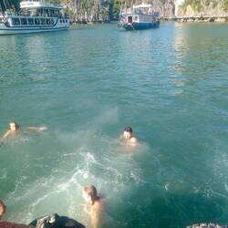 Zurück am Boot klettern wir mühsam hinauf, um kurz darauf wieder ins Wasser zu springen. Das geht eine ganze Weile so - es macht einfach super viel Spaß!