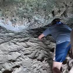 Nach ausgiebigem Trinken geht’s weiter zum nächsten Stopp. Schwimmen und schnorcheln stehen auf dem Plan. Vom Boot aus springen wir ins Wasser und dann müssen wir an Land schwimmen. Am Strand angekommen geht es nochmal durch eine Höhle - auf dem Bauch kriechend und robbend, da der Spalt wirklich sehr schmal ist. Der Boden besteht aus Muscheln, die sich spitz in unsere Haut bohren. Aber die Tortur hat sich gelohnt. Als wir wieder stehen können, wird der Blick auf einen Dschungel frei. Es geht barfuß hindurch, bis wir in einer offenen Höhle mit Sandboden, Felsen und Bäumen stehen. Hier sind überall Steinmännchen und es sieht beinahe wie aus einem Kult aus.