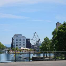 Selbst in der klimatisierten Kabine ist es zu heiß, um zu denken. Also ist die Aussicht einfach stumpf vorüber gezogen. Wesel, Friedrich Ebert Ufer in Duisburg und Leverkusen.