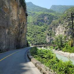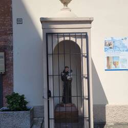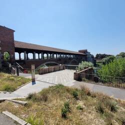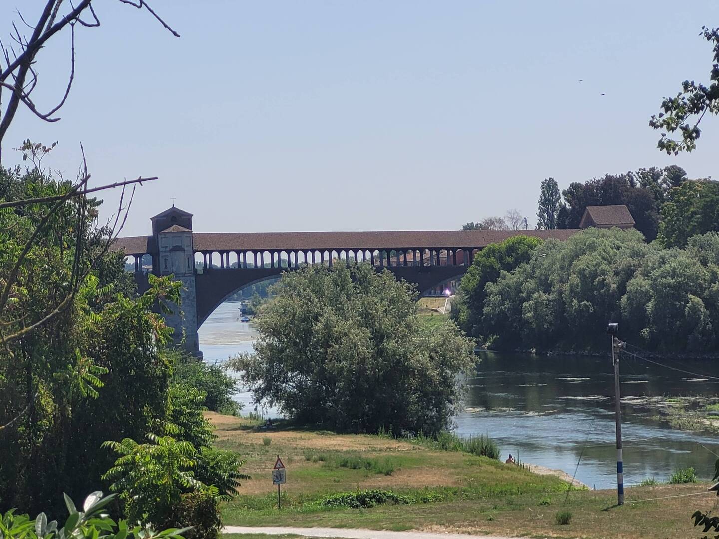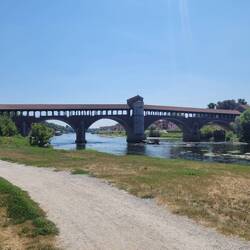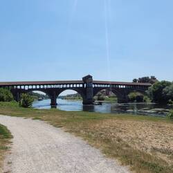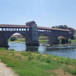 Steinerne Bogenbrücke über den Fluss Ticino mit überdachtem Fußgängerweg und kleiner Kapelle.