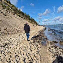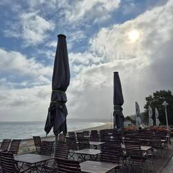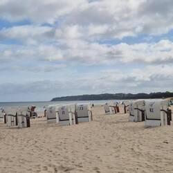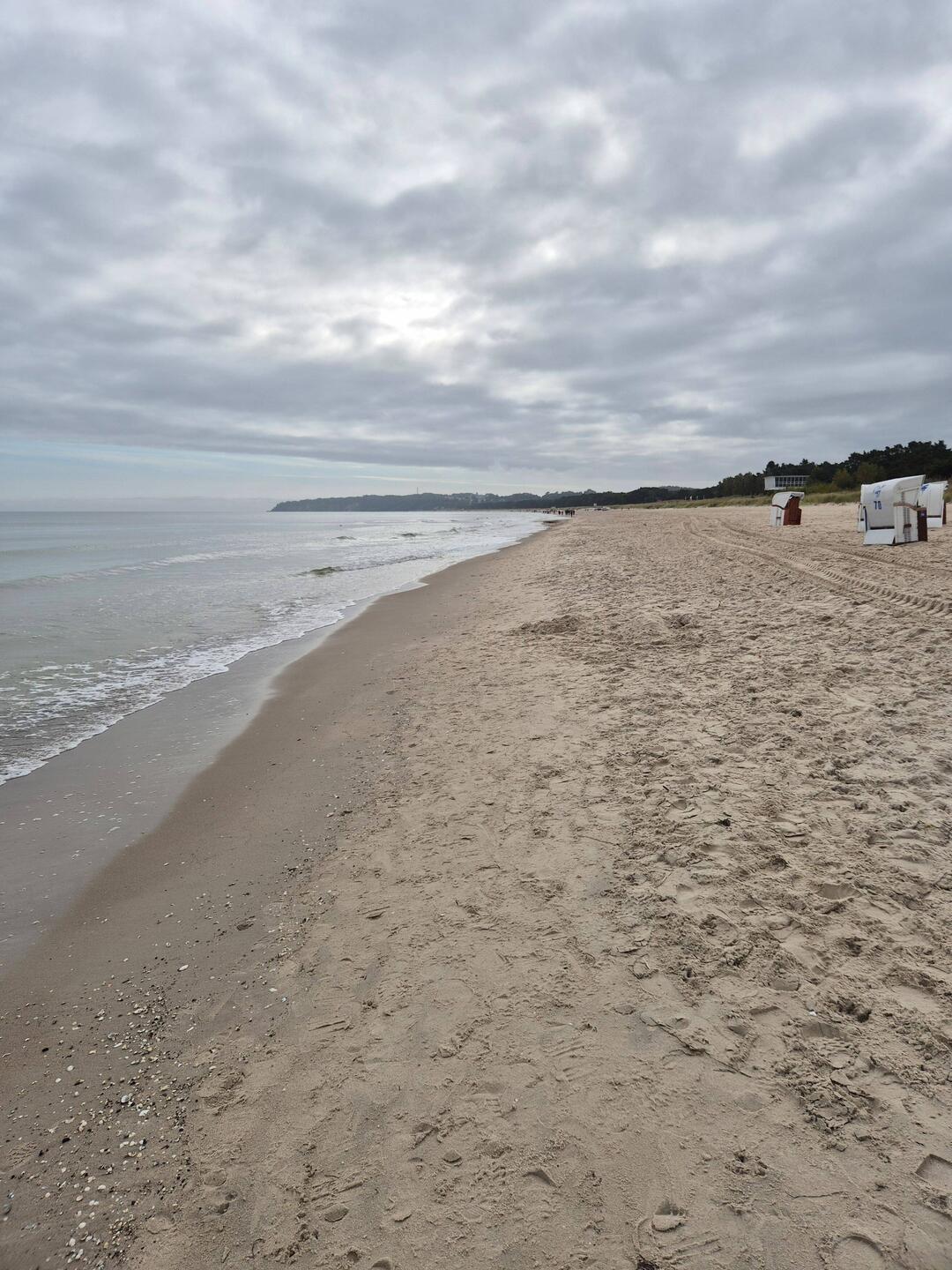 Eigentlich wollte ich ja Schwimmbad ,aber das Wetter soll erst Nachmittags schlechter werden ,also beschließen wir nach Baabe zu laufen ,am Strand entlang. Man sollte sich vorher erkundigen, oder wenigstens googeln,wie weit das ist ,denn Baabe liegt praktisch nebenan ....aber dazu später. Wanderschuhe an , heute die Daunenübergangsjacke und los geht's. Immer schön an der Wasserkante , diversen Hunden ,Möven , Nebelkrähen und buddelnden Familien ausweichend . Mein lieber Mann trägt die eingesammelten Fundstücke,damit ich fotografieren kann und zählt im stillen die Strandabschnitte: Sellin ,Sellin ,Sellin....Baabe 1- 16 , Göhren Nordstrand 1-7 .... Derweil wir fleißig weiterstiefeln. Bis plötzlich Bewegung ist ,oben an der Strandpromenade , könnte man ja was trinken ,wir gehen hoch und kommen doch wirklich am Schild raus: Willkommen in Göhren . Ähhh, wie jetzt ,wo ist denn Baabe abgeblieben? Na egal ,sind wir halt in Göhren ,hier kann man ja auch essen und trinken ,eine Seebrücke gibt's ebenso und ein " Schrägaufzug" kann dich nach oben bringen . Wir stärken uns mit Cappuccino, Eisbecher und einem Bierchen , fahren lustig mit dem Schrägaufzug , nur ,daß es da oben nix weiter gibt ,nur ( laut Google Maps) weitere Wanderwege/ - Touren . Aber wir müssen die Strecke zum Cliff-Hotel auch wieder zurück ; Hier ist nämlich auch die Endstation vom Rasenden Roland ,aber den möcht ich heute nicht fahren. Wir nehmen die Treppen nach unten und entscheiden,nicht an der Wasserkante zurückzulaufen , sondern die Strandpromenade oberhalb der Dünen zu nehmen . Und ratet mal ,wo wir da vorbeikommen , na klar , an Baabe , merkt man nicht an der Wasserkante,jetzt wissen wirs besser 😅 ! Jetzt aber hurtig ,es fängt an zu tröpfeln, doch wir haben Glück, der große Regen kommt ,wie vorhergesagt ,erst später. Erstmal Belohnung in der Cliff-Bar , es ist Viere durch und ich hab nun keine Lust mehr aufs Schwimmbad .