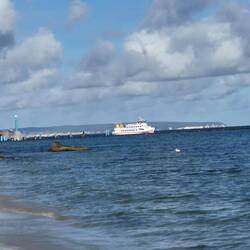 Die Sicht ist heute wirklich supi und irgendwie der Weg heute nicht so lang ,wie am Montag 😅 . Schon von Ferne beobachten wir die Tauchglocke ,sie ist in Betrieb,das verspricht interessant zu werden . Angekommen laufen wir gleich hinter , da ist die Tauchglocke schon unten , also wird das Auftauchen gefilmt . Und wir bekommen mit ,heute ohne Voranmeldung ,also ran und rin in die Tauchglocke. Nach kurzer Einweisung ( Gefahrenübung, faaalls der Strom ausfallen sollte) tauchen wir wirklich unter , 4 m tief,aber man sieht noch über uns die Wellenbewegung,das ist interessant. Ansonsten gefallen uns die Ohrenquallen,die mal größer,mal kleiner elegant durchs Wasser schwimmen ( ???) . Wir bekommen einiges erklärt,sehen ein Video ,was sich auf dem Ostseeboden so alles befindet und warum .Die Zeit ist viel zu schnell rum und wir tauchen wieder auf...ein schönes Erlebnis ☺️.