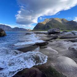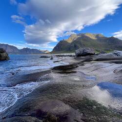 Nach einer 3,5 stündigen seeeehr schwankenden Fährfahrt sind wir auf den Lofoten angekommen! Wir haben DIREKT den ersten Platz angesteuert, in Moskenes und fahren morgen früh weiter.