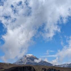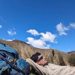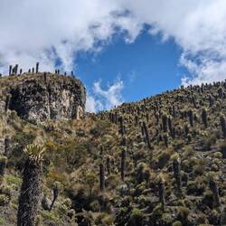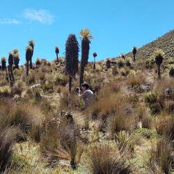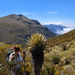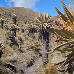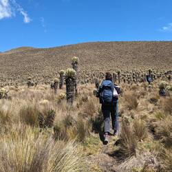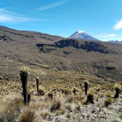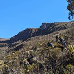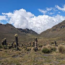 Jusqu'à présent on suivait des chemins assez visibles. Aujourd'hui ça se gâte après quelques kilomètres le tracé disparaît. On essaye de le retrouver, on le suit vaguement grâce aux cartes téléchargées et au point gps mais il est invisible sur le terrain. Malheureusement pour nous ça tombe sur le sommet à 4150m. On se retrouve donc à escalader la montagne en tentant de se frayer un chemin entre les arbustes, les touffes d'herbes, les racines, les crevasses, les vaches et les frailejones (ces espèces de grand cactus qui n'en sont pas). Je stresse un peu parce qu'on voit les nuages en fond de vallée se rapprocher et j'ai peur qu'on ne parvienne pas à retrouver notre chemin s'ils nous atteignent. On se dépêche donc de passer cette partie un peu compliquée. On fera une pause en haut. Sauf qu'à chaque fois qu'on croit avoir atteint le sommet, un autre se dégage juste derrière. Finalement on s'arrête, épuisé par notre montée en ayant dépassé la barre des 4000m. En face de nous se dresse le pointe enneigée du Nevado Tolima perchée à plus de 5000m. Sur notre gauche le Paramillo del Quindío avec ses flancs allant du beige à l'ocre. Autour de nous des centaines de frailejones. Et au-dessus de nous des nuages qui défilent dans toutes les directions à des vitesses ahurissantes. On reste un bon moment, allongé, profitant du sentiment d'être seul au monde et savourant notre chance d'être ici.