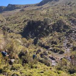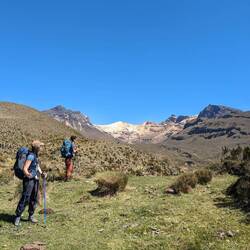 La pause finie, on tourne le dos au mont enneigé et on continue de grimper. Après quelques centaines de mètres ; ça y est on est au point le plus haut de notre parcours (mais pas le plus haut de la région, loin de là) et on passe sur l'autre versant. Tout au loin, au fond de la vallée on aperçoit ce qu'on imagine être là Finca Berlín. On a l'impression d'être presque arrivé car pour la première fois on voit où on va et surtout c'est en descente. La montagne nous apprendra qu'il ne faut jamais se réjouir trop vite. À chaque fois que l'on croit que ça y est on est dans la partie facile, non : on perd le chemin pour le retrouver, puis le reperdre (c'est la thématique de la journée), on doit traverser une rivière sans pont, re-escalader un flanc de montagne pour passer de l'autre côté, traverser des tourbières sans fin (et se tremper les pieds de boue).