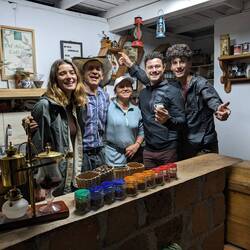 Après avoir fait un bon tour des différentes et (très) nombreuses étapes pour avoir un café de qualité il est maintenant temps d'y goûter. C'est Imelda qui se charge de nous préparer le café dans une cafetière à balance ; on est unanimes c'est l'un des (si ce n'est le) meilleurs café que l'on ait bu. Après le café, on a le droit de goûter du vin fait à base des cosses fermentées des grains de café (le petit fruit rouge dont on a extrait les grains), ça fait penser à du vin de noix artisanal. Enfin on a aussi l'occasion de goûter le miel de leur production, encore une fois on est unanime : c'est le meilleur miel qu'on ai goûté.