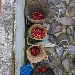 Jaime nous explique sa manière de cultiver ses plans et quels grains récolter pour avoir le meilleur café puis il nous met au travail. On doit cueillir les grains les plus rouges pour remplir notre panier. Rapidement il se met à pleuvoir et nous allons donc nous abriter. C'est dommage on serait bien rester plus longtemps dans les champs.