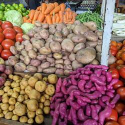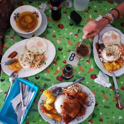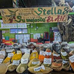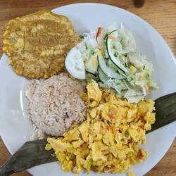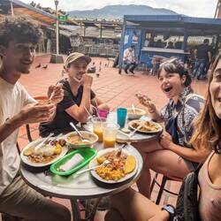 Ensuite direction le marché de la Plaza Minorista de José Maria Villa, le plus grand marché couvert de Medellin, pour le coup là plus aucun touriste. On se promène entre les étales de légumes et fruits exotiques on a envie de tout goûter, de tout acheter, malheureusement comme ce n'est pas un lieu très touristique on ne trouve pas d'échoppe vendant des jus frais. On finit par s'installer dans un petit boui-boui avec seulement des locaux et des marchands. Télio et Alex commandent un bendeja paisa (un plat typiquement colombien composé d'une assiette avec tout ce qu'on peut imaginer dedans : du riz, des haricots, des oeufs, de la banane plantain, de l'avocat, de la salade et toutes les viandes qui existent), je prends une assiette du même style mais ils acceptent de me la faire végé, c'est délicieux.