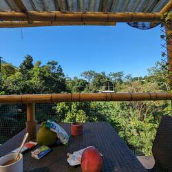 L'endroit est magnifique : une vue sur la mer des Caraïbes, sur la jungle et des parapentes qui volent au-dessus de nous. Une faune impressionnante : des perroquets colorés, des papillons géants, des chenilles tout droit sorties de 1001 pattes, un microcentrum (merci Google) un espèce de criquet vert géant et dans notre huttes on a le plaisir d'apercevoir des dizaines (voir des centaines) d'araignées. On les repère à leurs yeux brillants sous les projecteurs de nos frontales. Elles sont vraiment partout, heureusement on a des moustiquaires pour se protéger (même comme ça on est pas très rassuré).