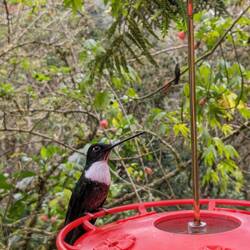 Au bout de 6km de marche et un bon dénivelé on s'arrête à la Casa de los colibris pour boire un chocolat chaud au fromage (heureusement le fromage était à côté de la tasse et pas dedans cette fois) et surtout admirer les dizaines de colibris qui volent autour de nous. Ils sont en liberté mais sont abreuvés et nourris par les quelques personnes vivant ici ce qui explique leur nombre.