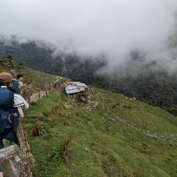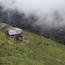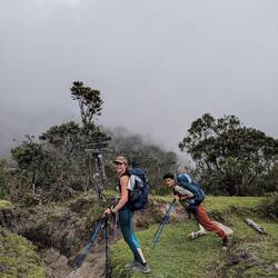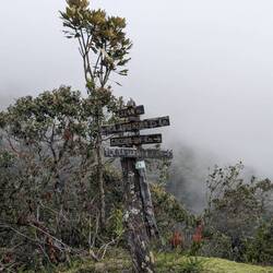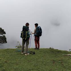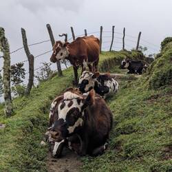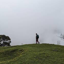 La première partie de la rando est assez fluide, on connaît le chemin on l'avait déjà fait avec Alex quelques semaines auparavant. On passe de la forêt tropicale aux champs verdoyants. On croise un verre de terre géant mais surtout des vaches et des chevaux. Rapidement les nuages nous rattrapent et on marche dans le brouillard, c'est pas gênant, ça ajoute même un peu de charne et surtout ça nous protège de la morsure du soleil (qui à cette altitude ne pardonne pas comme on l'apprendra dans les prochains jours).