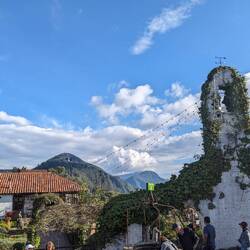 Normalement depuis la place centrale du village, derrière l'église on peut voir les glaciers du volcan Nevado del Ruiz et sa fumée. Malheureusement lorsqu'on arrive il pleut et tout est couvert.