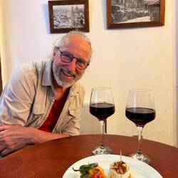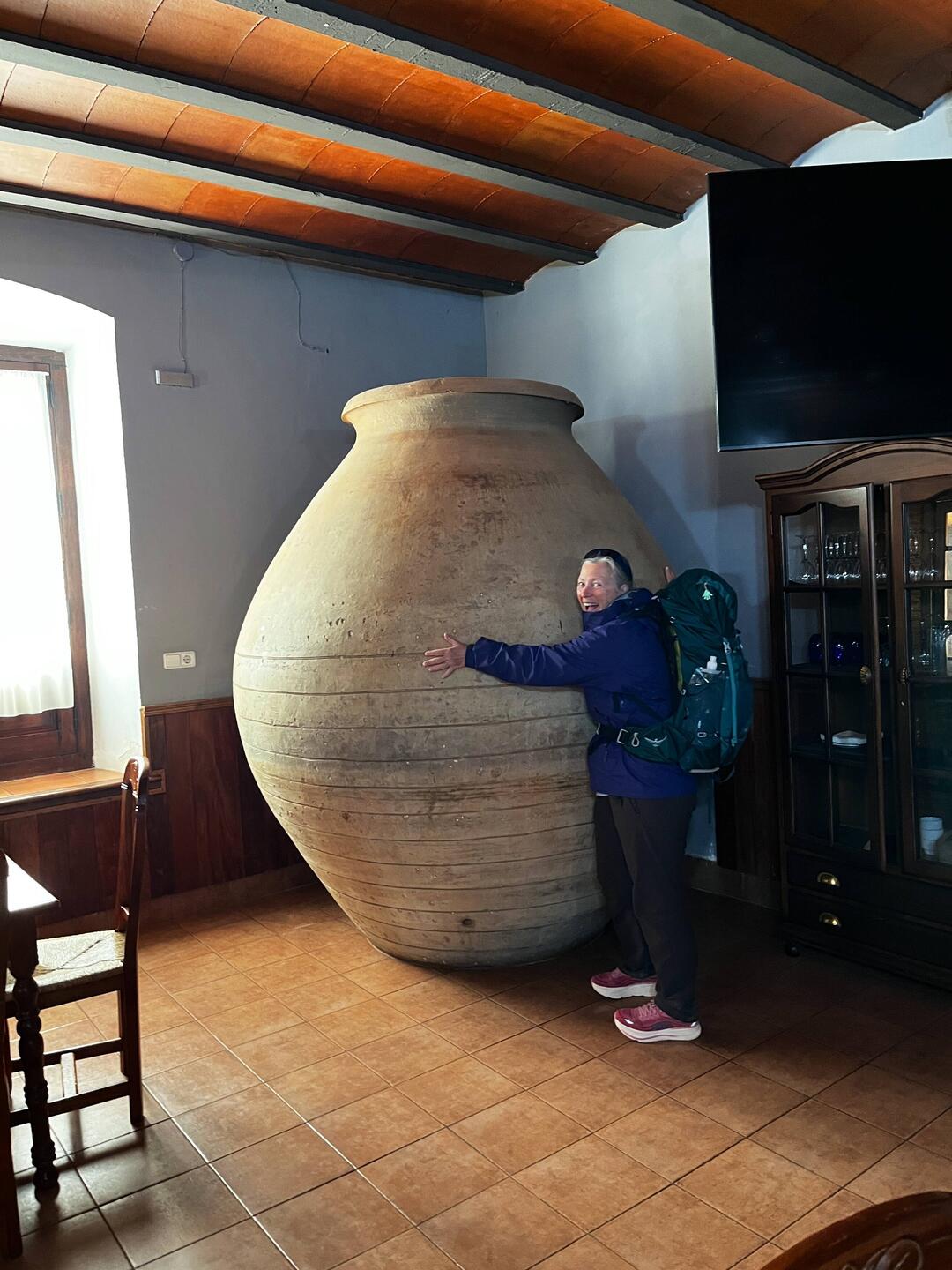 Bij het ontbijt ontdekt debi een mooi oud wijnvat die ze wel zou willen hebben. Ik heb haar beloofd dat als hij in mijn rugzak past dan neem ik die voor haar mee.