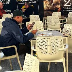 Binnen in het (grote) busstation was genoeg ruimte voor dieren. En zo niet, dan passen duiven zich altijd wel aan. Een duif wachtte op zijn beurt om een ​​hapje uit die baguette te nemen.