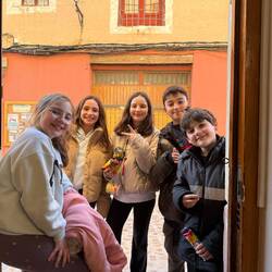 Terwijl we wachtten tot er iemand kwam, was ik er echter niet van overtuigd dat de politie ons zou verstaan ​​en zou komen opdagen. Uiteindelijk kwam er een klein meisje langs dat wat Engels aan het leren was en ons graag wilde helpen. Kort daarna arriveerde een politieagent (hij was inderdaad onderweg). Later ging de deurbel van de Albergue en kwam het meisje en vijf van haar vriendinnen aan met hun snoepzakken van vrijdagavond. We hebben een gesprek in het Engels gehad en iedereen gaf een bijdrage. Geweldige ambassadeurs voor Chinchilla.