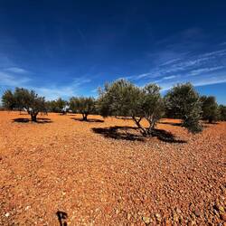 Today we take a shorter walk between vineyards and a single olive grove in slightly more uneven terrain. Every now and then we see small trees whose names I can't quite pinpoint. Fruit trees? But what then? Not oranges, because they still have leaves.