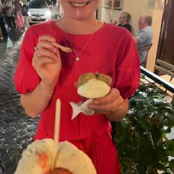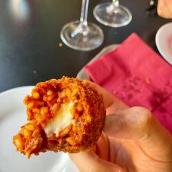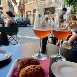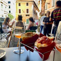 Once rested and cooled, we made our way over to Trastevere for some lunch - Again a TikTok reviewed place was in order - We went to Trapizzino which is Italian street food, pretty much Pizza base with a filling inside, we also had a Suppli Classico starter that is Mozzarella and risotto style rice Depp fried. Super Healthy lunch - so we had to wash it down with a glass of wine!