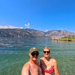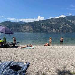 Upon walking near the entrance of the car park I noticed a lot of cars lined up, most car parks were full as we came through hence why we were happy to walk a bit further. These people were waiting for someone to come out of the car park so they can get a car park, we found this very strange but if they are happy to wait in the sun, in their cars, I’ll still call them idiots! We got the beach, I went in first, now we are used to the Mediterranean sea, balmy 26-28 degrees… this was very cold. Lake Garda is 300m deep in some parts and is feed from the hills/Dolomite area surrounding the lake, so naturally its cold icy water. Nether the less, the body got used to it and it was very relaxing! Katie took longer but finally made it in!
