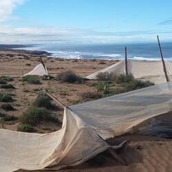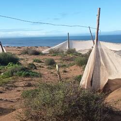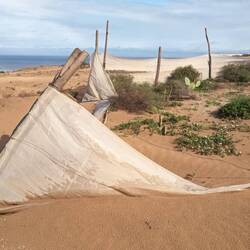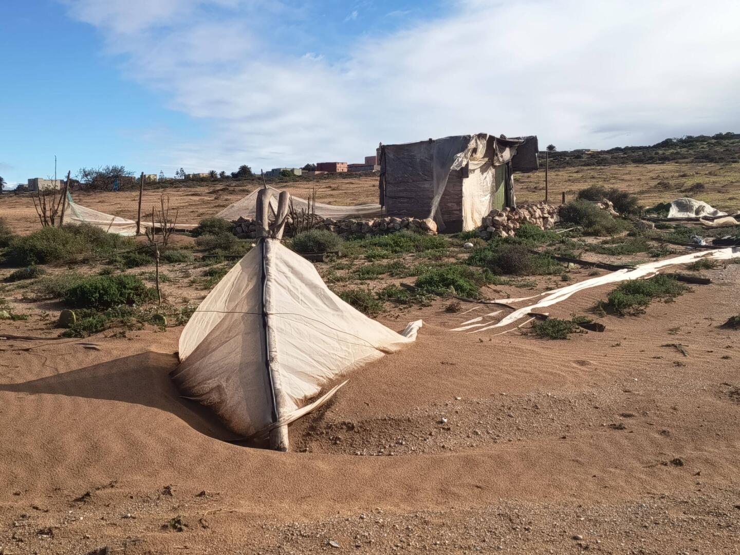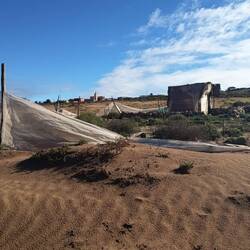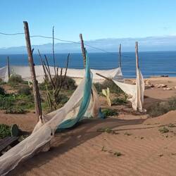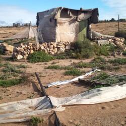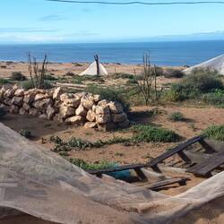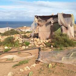 ... grob zusammen gezimmerte Hütte, mit dem kleinen Kakteen- und Steingarten, dem halb zerfallenen Zaun und dem zerfleddertem Windschutz fasziniert mich sehr!