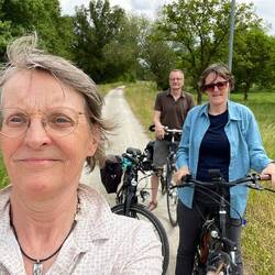 Gut geschlafen sind wir die Ersten um 8 beim Frühstück. Heute wollen wir eine Radtour machen und möglichst zeitig los. Ruth und ich haben ein Ebike, Thomas nicht, aber er kann trotzdem locker mitLue lisää