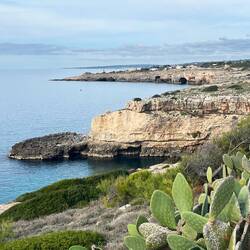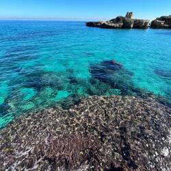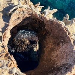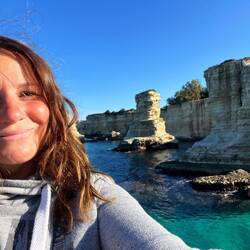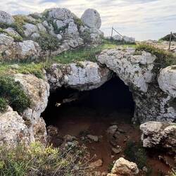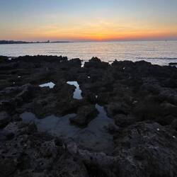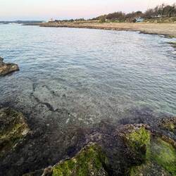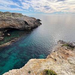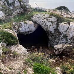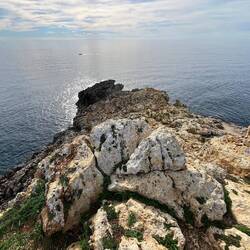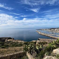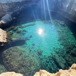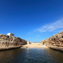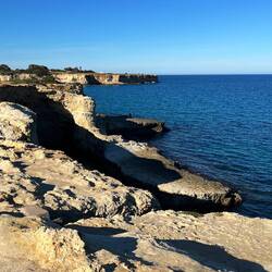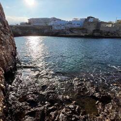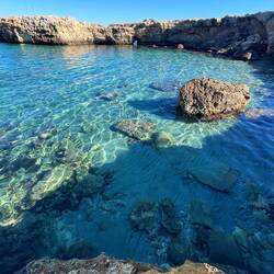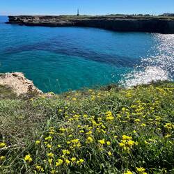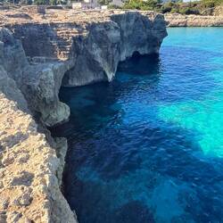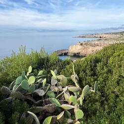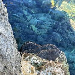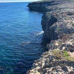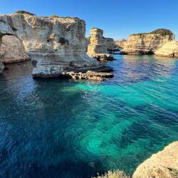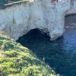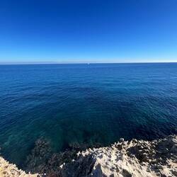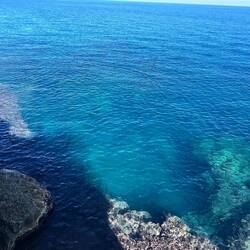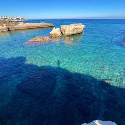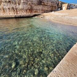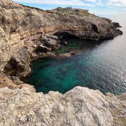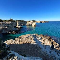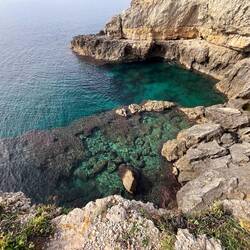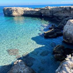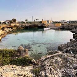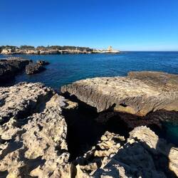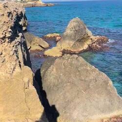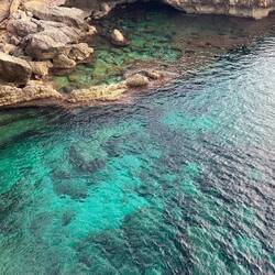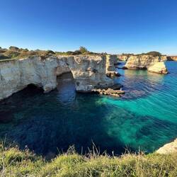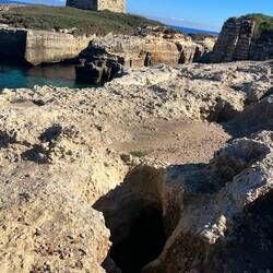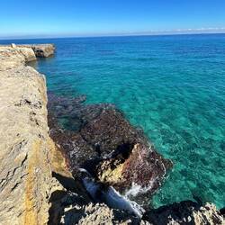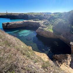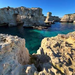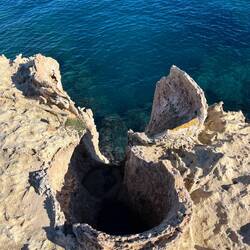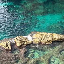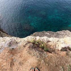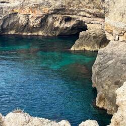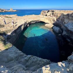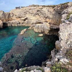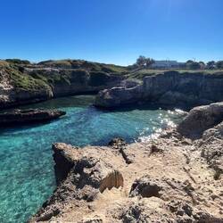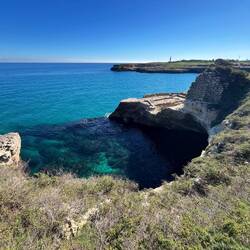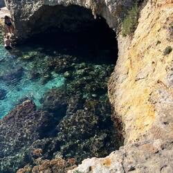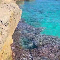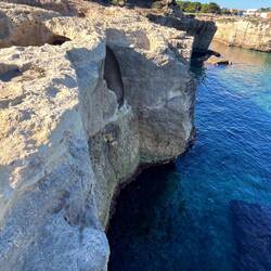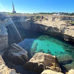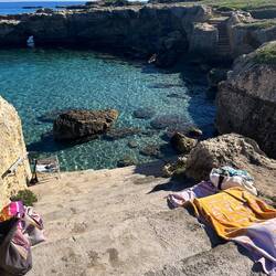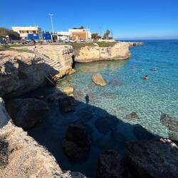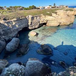 Wenn man aus Roca in Richtung des “poet caves” läuft, kommt man an einigen Ausgrabungsstätten vorbei (diese waren aber zu der Zeit nicht begehbar) und auf dem Gelände des “cave of poetry” gibt es weitere Ausgrabungen und eine Madonnen Figur die über das Meer blickt. Die Höhle an sich ist recht schön und der Klang darin ist toll aber das war es dann auch schon. Die Felsen drumherum sind unheimlich schroff und scharfkantig, eine bizarre Landschaft. Nach meinem Besuch da, ging es nach Roca zurück um eine Runde schwimmen zu gehen. Die Einheimischen teilten mir mit Händen und Füßen mit, das die Eisenleiter nicht mehr begehbar ist und das man an der Seite über die Steine ins Wasser hinabsteigen müsse. Gesagt getan, habe ich mich auf den stufenartigen Einstieg gesetzt, und geschaut wie ich mich am besten ins Wasser hinablassen konnte ohne direkt auf den Boden zu treten, da ich nicht sehen konnte ob es zwischen den Steinen Seeigel gab. Auf einmal zog etwas an meinem linken Fußgelenk. Ich dachte erst, es war wie eine Schlingpflanze oder so was aber als ich meinen Fuß hochzog, sah ich die kleinen Tentakeln die um meine Fesselgeschlungen waren, ich quiekte kurz und schüttelte den kleinen Oktopus mit ganzer Kraft von meinem Fuß. 😳😂 Ich war kurz perplex, einer der Männer kam um zu schauen ob alles ok war, ich zeigte auf meinen Fuß und sagte nur “polpo” er lachte und meinte dann, ich sollte mich einfach nach vorne fallen lassen (zumindest habe ich seine Worte und Gesten so gedeutet). Gesagt getan und ich war im Wasser, nicht sehr elegant 😅 aber ich war drin. Ich schwamm eine Runde aber das mit dem Oktopus hatte mich etwas verwirrt. Als ich wieder raus kam, kam der Mann um die Ecke um zu schauen ob ich Hilfe beim heraussteigen brauchte, hab ich aber hin bekommen und dann fasste er sich auch ans Fußgelenk und sagte etwas mit “polpo” im Sinne von ihm sei das eher auch passiert. Ich bin direkt noch mal zum Auto gegangen um meine Taucherbrille und Flossen zu holen aber im Wasser habe ich ihn nicht noch mal gesehen. Er wird sich wohl zwischen den Steinen versteckt haben. Dafür bi. Ich noch durch eine Höhle getaucht und es gab auch einige hübsche Fische. Nach dem Ereignis ging es weiter zum Sant’Andreas Tor, auch eine Steinformation mit einem etwas weicherem Stein, die wie ein Tor aussieht. Alles in allem, eine sehr schöne Umgebung.もっと詳しく