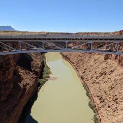Auf unserem Weg vom Grand Canyon zum Glen Canyon passierten wir diese schöne Brücke über den Colorado River. Somit sind wir offiziell im Navajo-Gebiet. Bei den 33 °C hielten wir es nicht langeBaca selengkapnya