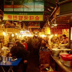 The day has alternated between overcast and cold and sunny and warm - the air is really quite clear but the town does have a bit of a smell about it. Probably it is the the air as it is everywhere. Walked around the Hongdae area and it is clearly a shopping and nighttime area - very closed in the morning. So - I caught the train(s) to Namdaemun Market. It is big and well known so worth a look. Required a train trip to Seoul Station then a lot of walking to the next line to Hoehyeon which exited straight into the market area. The streets around the indoor market area was more interesting than the market which was clothing and variety store stuff - huge but same same. No food inside and certainly not a produce market. Outside was the street food and everything I was expecting from street food blogs was there. Lots of fried food but also huge pig knuckle in pig knuckle stalls and also a couple other interesting themes. One was a batter cake affair that I hoped was the kimchi pancake and the other a classic stand up street diner with very traditional street food including blood sausage. I tried the pancake- they fold it into a cup - I ordered using classic mime and then as she passed it me she said ‘look out - it’s super hot’! Haha. It was ok - spring onion batter with a sweet mung bean paste inside. Nice but too sweet so a couple of bites then binned. Took a while to find somewhere as bins are non existent- wander what they do with their rubbish- take it home? I then tried the blood sausage - very soft and not strong flavoured at all - dipped in the soup and then the salt it was very nice. All eaten standing shoulder to shoulder at the counter. On the way back to the train I spotted a line at a door way. It was a very narrow covered in laneway that can only be called kimchi hall. There would have been about 15 separate lots each with a kimchi lady with her own little twist on the theme - fascinating and obviously very popular. Glad I saw it and walked through. Later in the arvo the clouds closed in trapping a growing smog and dropping the temperature considerably. I reckon we dropped a good 10 - 12o. I ventured out again to buy a running beanie as what I wore this morning in 8o isn’t going to cut it tomorrow in a predicted -3o! I also wanted to check out some potential dinner options. I wanted some real Korean fried chicken but didn’t find any today. Later I went out and found a place that looked ok. The staff were friendly and I chose a classic street food classic - tteokbokki . Small cylindrical rice cakes coated in a spicy sauce. Of course this was much larger than the street dish - enormous and clearly meant for more than one person. The street classic has seaweed covered rolls and so did this - there were several gyoza-type fried dumplings thrown in and several noodles - dried minute and big flat kway teow style. The flavour was great and with a super background heat - I did my best but sent a fair bit back. Enough beer so on the way home I bought a Chile Merlot from the 7/11 for a glass or two in my warm room. Early start tomorrow as I have a half day DMZ tour!Читать далее