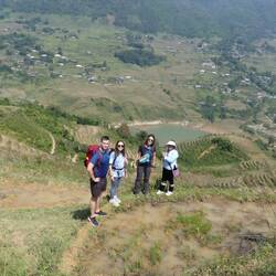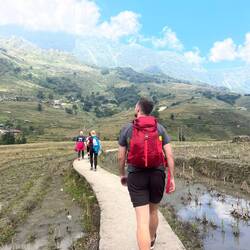Morgens um 9:00 Uhr ging es los. Wir haben uns mit unserem Guide (einer Frau, die der ethnischen Minderheit angehört) und acht anderen Touristen getroffen. Sobald wir aus der Stadt rausspazier sind, folgten uns ungefähr acht weitere Frauen, die der ethnischen Minderheit angehörten, um uns zu begleiten und auf dem Weg zu unterstützen. Der Weg war abenteuerlich. Eine Nacht vorher hatte es geregnet, daher waren einige Trampelpfade sehr schlammig und rutschig.