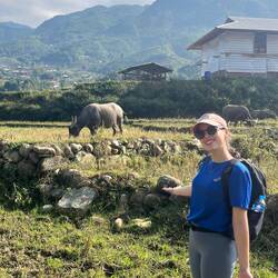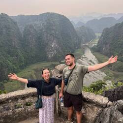 Es ging Berg auf und ab, über Flüsse, durch die wilde Natur, zwischen riesigen Bambuswäldern hindurch und durch die weitreichenden Reisfelder. Die Natur war atemberaubend. Wir haben immer wieder Buffalos gesehen, die friedlich in den Reisfeldern badeten und sich mit Schlamm bedeckten, um sich vor der Sonne zu schützen. Sehr schlau. Gegen Mittag haben wir einen Lunch-stop gemacht in einem kleinen, ursprünglichen Dörfchen. Hier kamen wir dann auch mit den anderen aus unserer Gruppe ins Gespräch. Es waren wieder viele unterschiedliche Nationalitäten dabei. Ich habe das Gefühl, dass mein Englisch auch immer besser wird. Nach dem Mittag hat uns Sáng (unser Guide) ein zu Hause von Dorfbewohnern gezeigt. Alles ist wirklich sehr simpel in dem Haus gewesen. Ich hab mich ein bisschen wie in einem anderen Jahrhundert gefühlt, wenn ich ehrlich bin. Dann hat uns Sáng noch gezeigt, wie man Mais mit einem altertümlichen gerät fein zermalmt. Wir durften auch mal probieren und es war richtige Knochenarbeit. Am Nachmittag haben wir uns dann von dem Rest der Gruppe verabschiedet, weil die nur eine Tagestour gebucht haben. Nur eine Schweizerin und ein Franzose sind mit uns zum Homestay gewandert. Gegen 16:30 Uhr waren wir endlich da. Praktisch war, dass gegenüber von unserem Homestay ein kleiner Massagesalon war. Das hat gut gepasst. Wir Haben also unsere Sachen abgelegt, nachdem wir herzlich mit Tee von unserer Homestay Familie begrüßt worden sind und haben uns dann eine halbe Stunde lang die Füße und Beine massieren lassen. Man war das gut! Dann gab es auch schon Abendbrot. Uns wurde ein richtiges Festmahl aufgetischt und wir haben mit der Familie zusammen gegessen. Zudem gab es selbst gebrannten Reiswein. Ich hatte ein bisschen das Gefühl, dass sie uns abfüllen wollen. Leicht angeschwippst und unglaublich müde sind wir dann in unser Baumhaus gegangen und ins Bett gefallen. Am nächsten Tag hat uns unsere Homestay Mutter mit Pancakes und Bananen geweckt. Unser Homestay Opa hat Tabak aus so einer riesigen Bong geraucht. Das machen hier übrigens viele. Es ist aber nur Tabak, wovon sie nicht high werden. Sieht trotzdem irgendwie verrückt aus. Wir haben gefrühstückt, dann noch ein Gruppenfoto gemacht und sind wieder los gewandert. Das Highlight war heute ein Wasserfall in dem wir uns erfrischen konnten. Danach sind wir wieder durch die Reisfelder gewandert und sind schließlich in einem anderen kleinen Dörfchen angekommen, um Mittag zu essen. Von dort wurden wir mit dem Bus wieder nach Sapa gefahren. Es war eine unglaublich schöne Erfahrung, eine so persönliche Tour mit einer einheimischen durchzuführen. Zudem haben wir so liebe Menschen kennengelernt. Mit dem Franzosen (Nathan) und der Schweizerin (Tiffany) waren wir abends noch in Sapa essen und haben einen Tempel besichtigt. Dann ging es mit dem Nachtbus auch schon nach Ninh Binh.Leer más