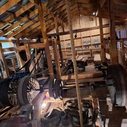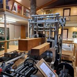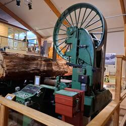 Weiter geht es zunächst auf der Küstenstrasse Hibiscus Coast Highway nach Norden. Dann ab Warkworth wieder die M1 und immer weiter nach Norden . Es wird einsamer und hügeliger. Nach 100 km kommen wir im Zentrum der früheren Kauri Nutzung an. In Matakohe gab es Sägemühlen zur Verarbeitung von Kauri. Kauri ist ein gigantischer Baum, der nur in Neuseeland im Norden der Nordinsel vorkommt. Er hat ca. 2...4 m Durchmesser. Es sind aber auch schon Exemplare mit 8 m Durchmesser gefunden worden. So einer ist dann 4000 Jahre alt. Der Baum hat ein wunderschönes Holz und wird (wurde - heute sind sie streng geschützt) für Boote, Masten, Häuser aber auch Möbel verwendet. Früher war es echt harte Waldarbeit , diese Riesen zu fällen. Ochsengespanne mit acht Ochsen haben die einzelnen "Logs" aus dem Wald gezogen. Dann gab es fahrbare, mit Dampf betriebene Winden. Später eine 60 PS Caterpillar Raupe mit vier Zylindern und einer 25 to Winde. Die Sägen im Museum sind beeindruckend. Ich dachte, meine Motorsäge hat ein langes Schwert mit 0,70 m. Hier sprechen wir von Sägen mit 2 m langen Schwertern. Die teilweise von zwei Personen bedient wurden. Einer hat am Motor angefasst und ein zweiter Griff war am Ende des Schwertes. Anbei ein Bild von so einer Säge. Außerdem für den Fan von alten Maschinen eine Zweizylinder Dampfmaschine mit 22 PS. Die hat das ganze Sägewerk über 20 Antriebsriemen betrieben.