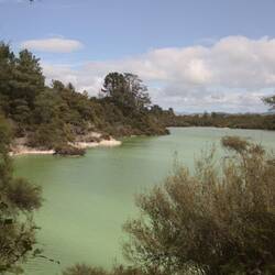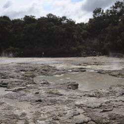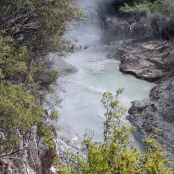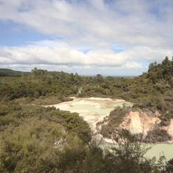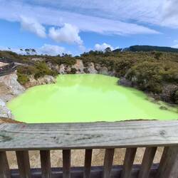 Wir sind über Tauranga nach Rotorua gefahren. Tauranga hat einen großen Hafen und ein richtig uriges Fischrestaurant oder besser einen Fischimbiss. Dort essen wir dann auch Fish&Chips. Super viel Betrieb. Die Locals holen hier ihr Mittagessen. Besteck gibt's nie zu Fish&Chips. Die isst man mit den Fingern. Salz und Essig gehören darüber. Wir unterhalten uns mit einem Ehepaar aus der Landwirtschaft , mit dem wir den Tisch teilen. Sie haben schon öfter Deutsche zum Work&Travel zu Gast gehabt. Diese Gäste waren wohl immer tüchtig und praktisch. Ein Mädchen hat sogar ihren Frontladetraktor bedienen können. Tauranga liegt in der Bay of Plenty. Schon James Cook hat ihr diesen Namen wegen der unglaublich üppigen Vegetation gegeben. Hier gibt es in der Tat in der Vegetation alles. Zypressen, Palmen, Bananen , Farne , Rhododendron , Callas, Rosen, ...... Allerdings hat Tauranga auch wegen des großen Hafens einen industriellen Charakter. Dann geht es weiter nach Rotorua. Das ist ein touristischer Hotspot. Hier zischt und dampft es aus tausenden Löchern im Boden. Rotorua verzaubert durch eine geothermische Wunderwelt aus Geysiren und Thermalquellen. Wir suchen auf den Internetseiten der Badehäuser nach einer Möglichkeit für ein Bad. Soll dann 345 € für drei Stunden kosten. Es gibt auch hot pools auf dem Campingplatz for free. Dort bade ich zweimal. Ein Pool auf dem Campingplatz hat 38 ° und der andere 42 °. Bei 42° wird es körperlich anstrengend. Ich habe Schweiß auf der Stirn und der Körper wehrt sich gegen das heiße Wasser. Schon auf dem Campingplatz muss man aufpassen, wo man hintritt. Ein Bach, der kochend heiß ist, fließt durch den Campingplatz . Die Maoris kochen heute noch in Erdlöchern , die vom Dampf beheizt werden. Das nennt sich Hangi. Wir haben so einen Dampfofen auch auf dem Campingplatz. Daneben die Rezepte auf einer Holztafel. Eine Lammkeule soll 3,5 Stunden in diesem Ofen köcheln. Es stinkt auch oft nach faulen Eiern, der typische Schwefelgeruch. Außerdem gibt es in Rotorua sehr viel zur Maori - Kultur zu sehen . Heizung hat hier kein Haus. Die bohren ein Loch in die Erde und leiten den herauszischenden Dampf in die Heizkörper des Hauses. Wir gehen in die sehr gepflegte Stadt und wandern an der Lakefront entlang und kommen zur Sulphurbay. Überall Warnschilder, dass man den Weg nicht verlassen soll. Auf keine Fall auf den kochenden, dampfenden Matsch treten.