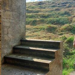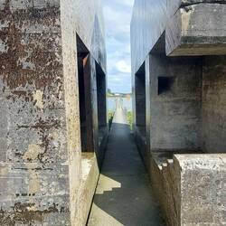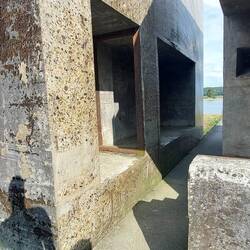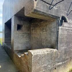 Ehemalige Gruppenunterkunft 599. Dieser Bunker wurde 4 wochenlang mit einer Diamantsäge aufgeschnitten. In der Mitte fehlt jetzt ca. 1 m und ermöglicht somit den Durchgang.