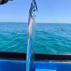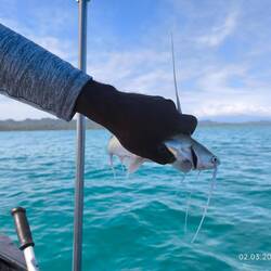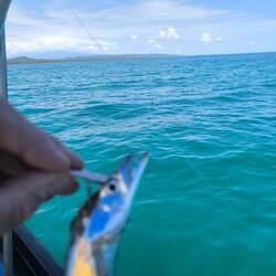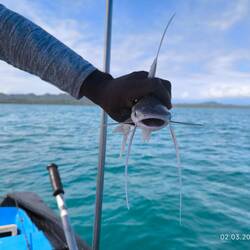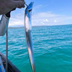 Mein erster Fisch war ein kleiner Groper, zu klein, dann ein Catfish, der giftig ist und King ihn nach ein paar Bildern wieder rein warf und dann noch zwei dieser sehr komischen Bandfische. Dünn, lang wie ein Aal und Zähne wie ein Piranha.