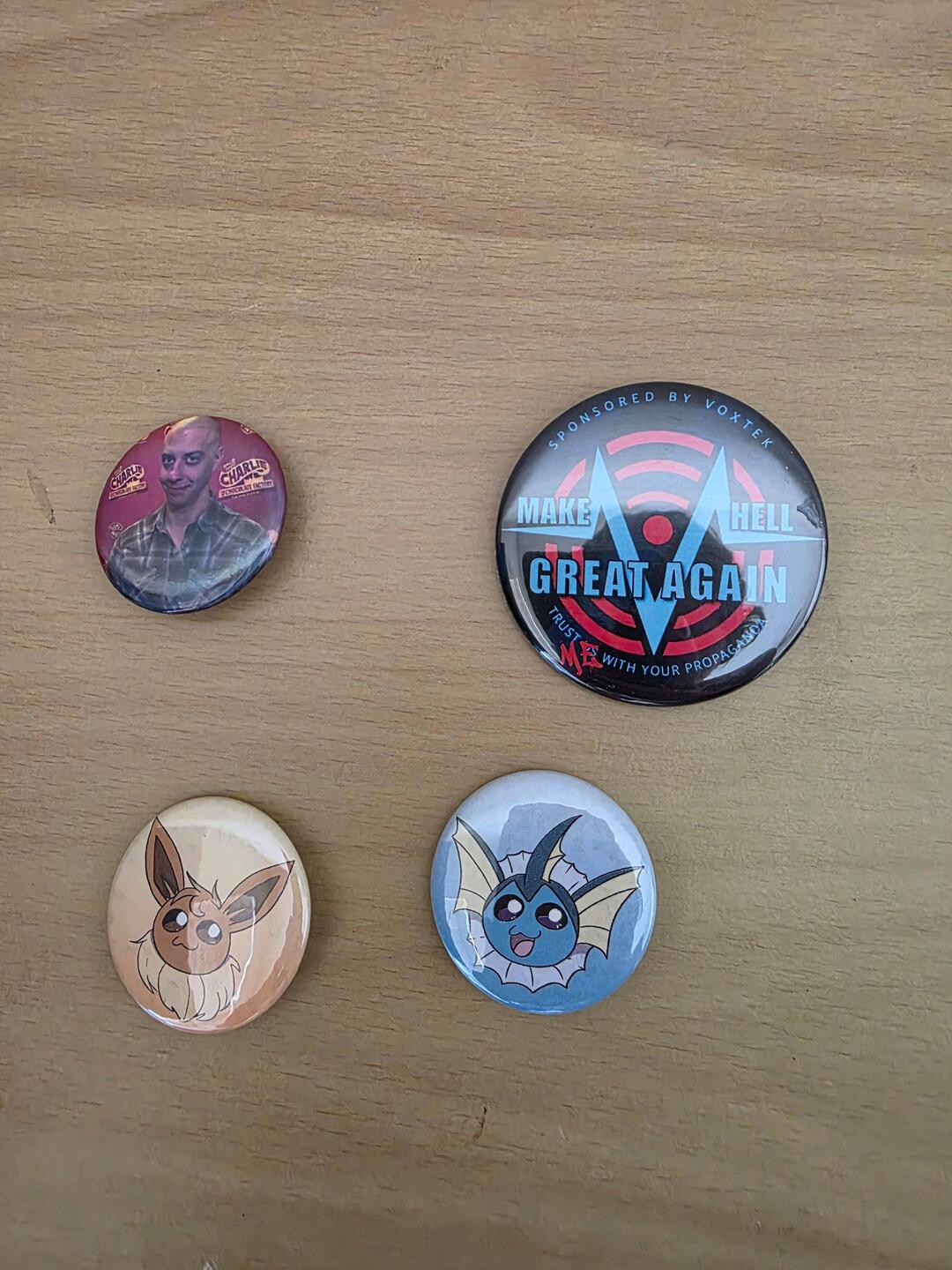 These pins were gifted to me by various people. Some in cosplay, nate gave me 2 Evee pins.