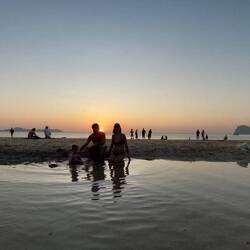 Desayuno bajo el árbol,playa, jugar , ir a comer y por la tarde un paseo hasta el atardecer allá donde baja la marea.