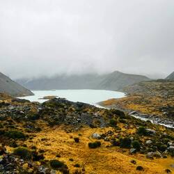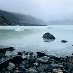 Today, I am hiking the Hooker Valley Treck at Aoraki/ Mount Cook. Well, the weather is quite rainy, but I still head off on my 20 km hike to the glaciers, wearing my raincoat.