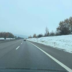 Immer noch bei strahlender Sonne und 16 Grad. Kurz vor Genua kommen dann Wolken auf, der Himmel wird dunkel und wir fahren in Richtung Norden. In Richtung Berge. Die Temperatur fällt schneller als eine Aktie nachdem Patrick sie gekauft hat und das "Ping" des Eiswarners zeigt an, dass es jetzt weniger als 4 Grad hat. Dazu hätten wir kein Ping gebraucht, wir sehen es am Schnee auf der gesperrten Fahrspur direkt neben uns. Als es gestern Nacht in Monaco geregnet hat, hat es hier geschneit. Die Temperatur fällt auf 1 Grad und alle 5 Kilometer macht uns ein Schild darauf aufmerksam, dass aktuell Winterreifenpflicht besteht. Alternativ können Schneeketten genutzt werden. Das würden hier zwar nicht einmal die Holländer machen, aber auf Sommerreifen ist es jetzt trotzdem uncool. Wir fahren wie auf rohen Eiern und vergrößern den Abstand zum Vordermann. Das fordert die Italiener heraus. Wir werden angehupt, es wird von hinten aufgeblendet und riskanten Überholmanövern, folgt der Austausch von Höflichkeiten mittels Zeichensprache. Patrick will eigentlich durchfahren, weil ein Stopp das Risiko birgt, dass wir mit den Sommerreifen auffliegen. Micky besteht dann aber auf die technische Pause und sie wird durchgeführt. Dabei stellen wir fest. Es ist wirklich richtig glatt. Gut, dass es jetzt in tiefere Regionen geht. Richtig warm wird es heute nicht mehr , dazu liegt der Nebel zu bleiern über der Poebene. Aber wir bekommen 5 Grad angezeigt und damit fühlen wir uns sicher.