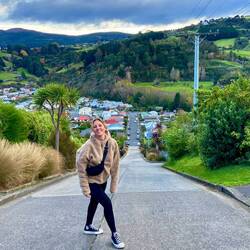 Anschließend sind wir zur „Baldwin Street“, die steilste Straße der Welt 🗺️. Die Straße hat es auch bis ins Guinnessbuch der Rekorde geschafft und hat eine Steigung von 34,8% und ist 350 Meter lang. Wir sind natürlich bis ganz oben gegangen und haben sehr kreative Fotos gemacht😂 War sehr amüsant. Wohnen möchte man da aber nicht, bei den ganzen Menschen die tagtäglich dein Haus fotografieren 🥹. Zwei, drei Autos sind auch mit einer hohen Geschwindigkeit hoch gedüst, haben gewendet und sind wieder runter gefahren. Eigentlich steht dort ein Schild, dass man das gerade nicht machen soll 😂