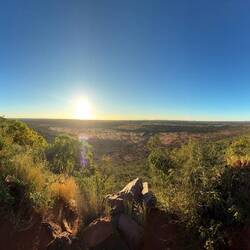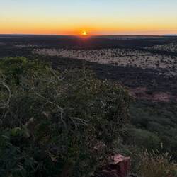 Zur goldenen Stunde trafen sich beide Gruppen – die Africat-Gruppe und unsere Leopardengruppe – auf einer Anhöhe mit gigantischem Ausblick über das Buschland. Die Sonne tauchte die Weite in warmes Licht, und wir stießen mit unseren Sundowner-Drinks an. Affen saßen neugierig neben uns, der Wind wehte leicht – pures Gänsehautfeeling.