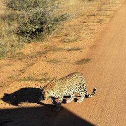 Und dann: ein starkes Signal – die Fahrt wurde wilder. Über Stock und Stein, durch Dornbüsche, quer durchs Gelände. Kein Weg war zu unwegsam, kein Busch zu dicht. Schließlich tauchte sie auf: Wamosch, eine wunderschöne achtjährige Leopardin. Wir sahen sie ganz nah – beim Markieren eines Baums, beim Überqueren der Straße direkt vor unserem Auto, sogar beim kurzen Zögern, ob sie vielleicht auf unsere Ladefläche springen sollte. Sie duckte sich an, prüfte – und bog dann doch ab. Atemberaubend!