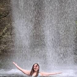 Today we went on an epic adventure to the Ecuadorian Amazon. The day started off with a long and winding bus ride to Puyo. Once we got off the bus we began a hike through the rainforest towards a waterfall. This hike was very beautiful and it was so cool to be in the rainforest. We saw some spider monkeys jumping from tree to tree and some other birds and insects. Our guide also got some clay from the river and used it to give me a facial (Angus opted not to participate lol). Eventually we reached the waterfall which was stunning. We had the opportunity to swim in the pool of water and Angus and I both did! We were able to go right under the falls and have a shower in the waterfall which was so fun. We then walked back and continued on our journey.