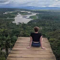 The next day we had an early start at 4:30am. We got into the boat and went for 45 mins along the Tambopata River to arrive at the clay licks. This is an amazing natural phenomenon where hundreds of macaws and parrots gather on this clay wall in the morning to lick the minerals off of it for food. This was probably my favourite part of the trip (though it is tough to choose a favourite because everything about the rainforest was epic)! It was so stunning to see all of these birds in their natural habitat. There were so many types and different coloured ones and the sounds were crazy. This was such a special and unique experience and I loved just getting to sit and watch the birds for a few hours. We then had a picnic breakfast before going for a wildlife spotting boat trip. We saw another caiman and about 14 capybaras! These were so fun to see in the wild and we were able to get close to them in the boat as they relaxed on the shoreline. We then returned home for some free time before lunch. Afterwards we set out for our second activity of the day: kayaking. Angus and I shared a two person kayak and then paddled down the river. We tried going upstream for a while but made hardly any progress 😂 so we paddled downstream the rest of the time. We had more paddling experience than the rest of our group so we got quite a bit ahead of everyone, which was amazing. It really just felt like us and the Amazon. We had so much fun just paddling, chatting, looking for animals and birds, and just enjoying the view. We then stopped at a little island where we were able to swim in the river! The water was very refreshing and we both loved getting to swim in the Amazon! Our final activity for the day was a night hike in search of nocturnal animals and insects. We saw lots of spiders and bugs and even a tarantula! I was paranoid about the snakes above my head the whole time (we didn't see any snakes though so that was good) so I was looking up at the trees instead of down for insects, which ended up being a good thing as I spotted a sloth! I felt so satisfied cause everyone else walked past it except me and the whole group were so impressed that I found one!